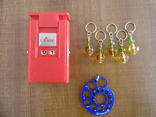 | This accessories package includes: a row counter, five stitch markers, and a needle gauge. |